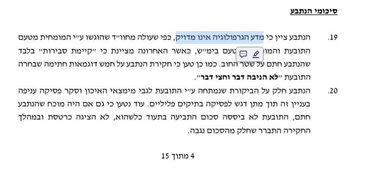 נניח שאני עורך דין בינוני. אני רוצה לטעון שמדע הגרפולגיה אינו מדע מדויק. אני יכול לעשות זאת על ידי ציטוט של כב' השופט עדי הדר בת"א 9051-11-14 נגה נ' נחום. מה אני אעשה? אכתוב "מדע הגרפולוגיה אינו (ראו פסקה 19 לפסק הדין). זה אכן כתוב בפסק הדין. תסתכלו!